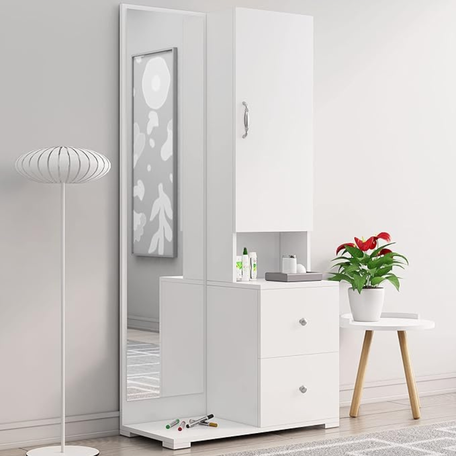 The Aurea Dressing Table combines sleek design with generous storage, making it the perfect addition to any bedroom. With its frosty white finish, elegant golden detailing, and a built-in mirror, this vanity table offers both functionality and style.
