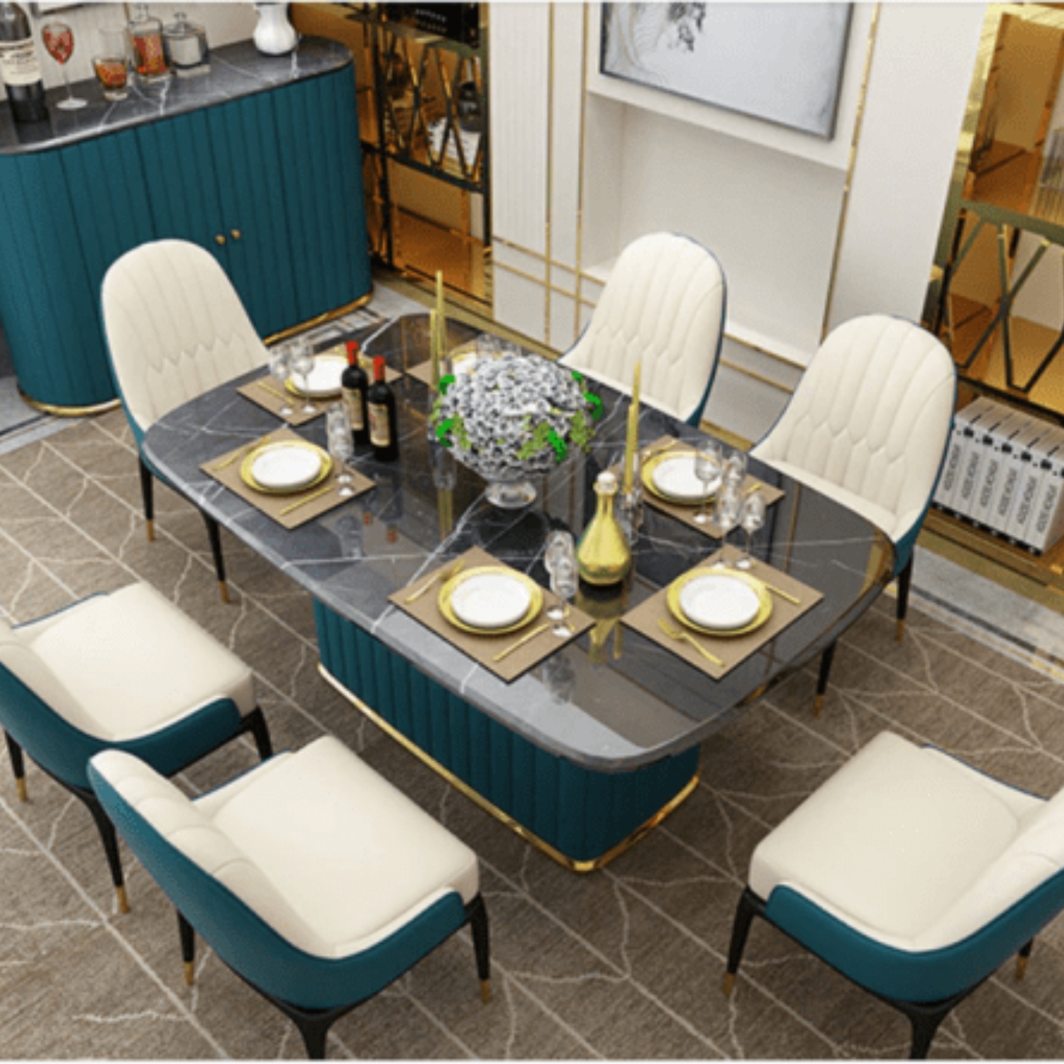 The Elysian Luxe Dining Set brings a perfect blend of elegance and functionality. With a durable marble top, stainless steel accents, and hidden storage, it elevates your dining experience.