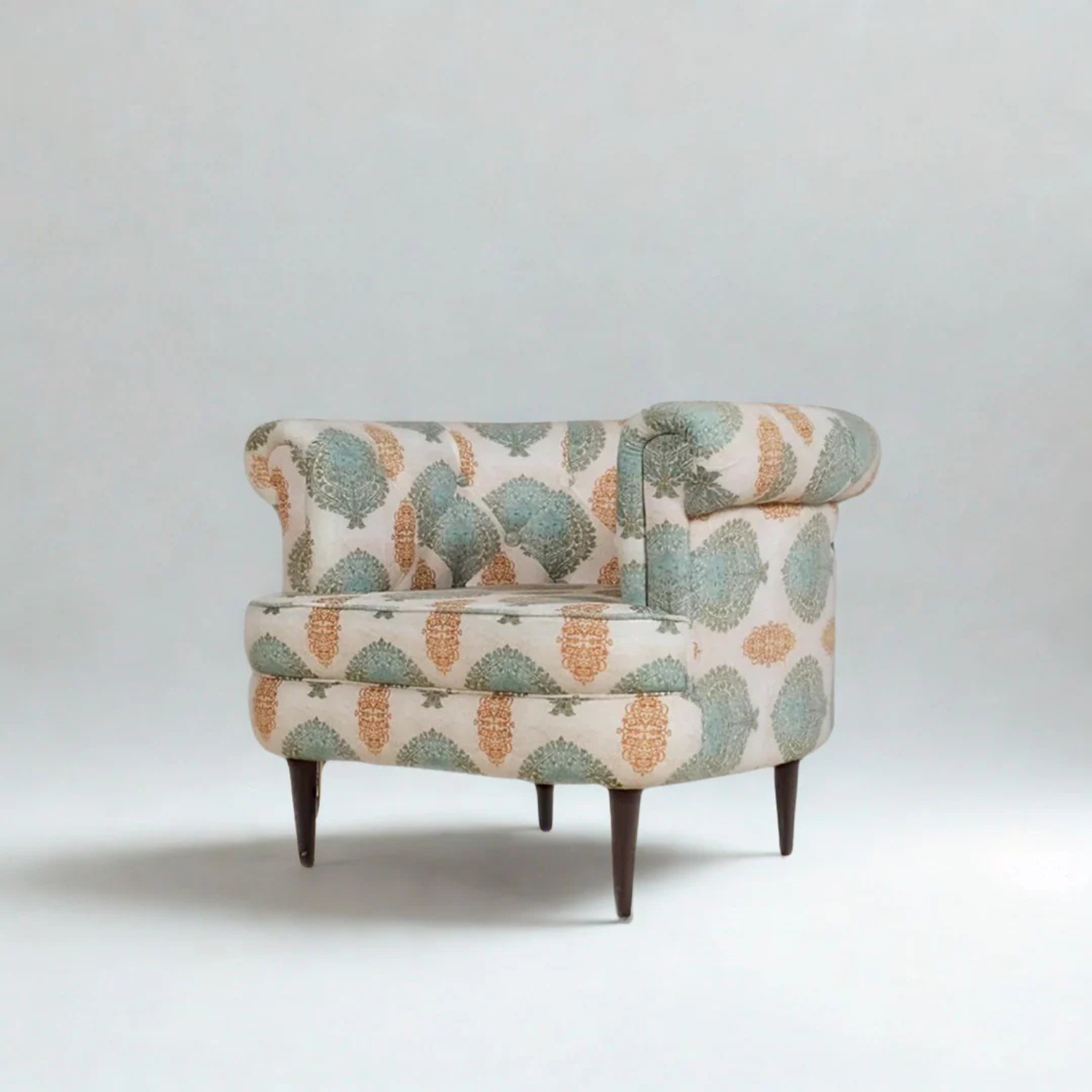 Crafted for luxury and relaxation, the Flora Bardot Lounge Chair features a tufted, cushioned back for superior support and a rounded silhouette for extra comfort. Upholstered in premium suede with floral prints, it offers both style and coziness. Built on a solid Meranti wood frame with teak legs, this chair is designed for long-lasting durability while enhancing your interior with its refined aesthetic.