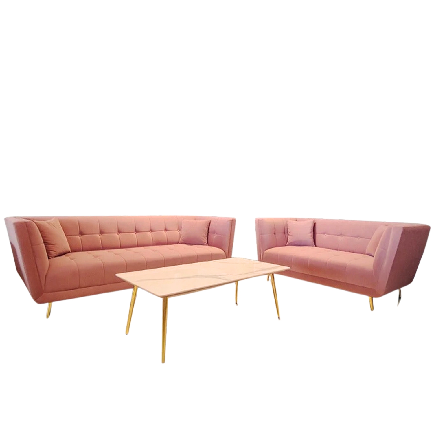 The Mofasa Sofa brings sleek Scandinavian minimalism into your living room. Crafted in rose gold premium velvet with golden steel legs, it perfectly blends elegance and comfort.